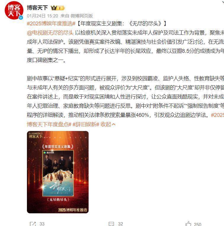 《无尽的尽头》是一部高质量电视剧,它聚焦未成年人司法保护,讲述了检察小组初创期,检察官林之桃与助理检察员白恩宇为守护孩子们,携手对抗人性之“恶”的故事。