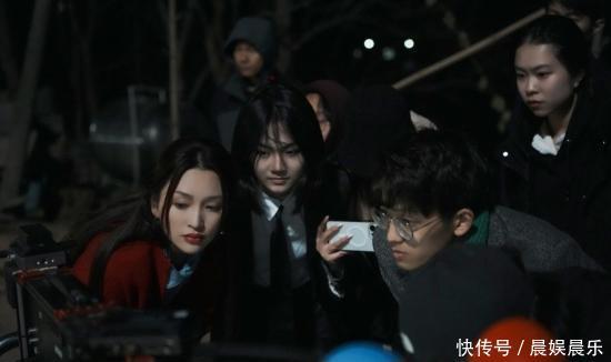 夜间拍摄,金莎与蓝灿昭及工作人员围看监视器回放画面。